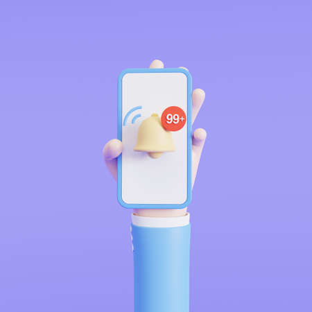 Cartoon hand holding the phone with Notification yellow bell with 99 number Social media chat, message, SMS, subscribe, 3d illustration