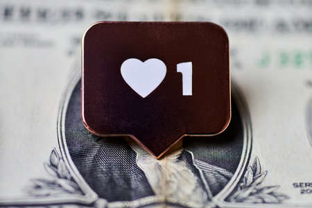 Like heart symbol on dollar. Like sign button, symbol with heart and one digit. Buy followers for social media network marketing. Cheap price concept.