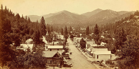 This antique photograph depicts a historical town situated amidst a mountainous backdrop. The scene showcases buildings along a main street, framed by trees. The sepia tones and aged appearance provide a vintage aesthetic. This image would be suitable for editorial and commercial use, such as illustrating historical themes.