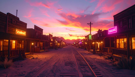 As the sun sets in a blaze of pink and orange, a quiet western town comes to life. Neon signs flicker on, casting a modern glow on the dusty main street and old wooden storefronts, creating a scene of nostalgic tranquility and cinematic beauty.