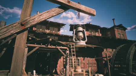 A classic lantern swings gently from a wooden post in a sunlit old western town, with wooden buildings and rustic structures in the backdrop, evoking a sense of history and adventure.