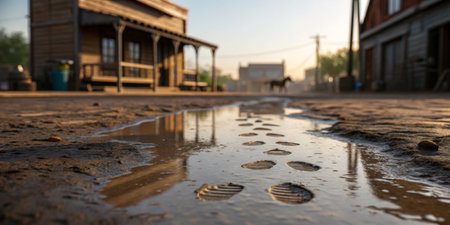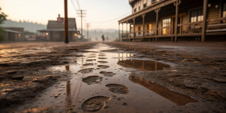 Water collects in puddles as footprints mark a forgotten street of an old western town.