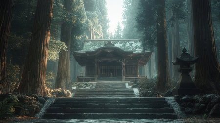 Ancient Stone Stairway Ascends Through a Misty Forest to a Traditional Japanese Shinto Shrine