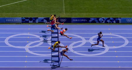 Amine Bouanani (ALG) of Algeria, competes in the Men's 110m Hurdles Round 1 at the Stade de France Stadium during the 2024 Paris Summer Olympics in Paris, France.