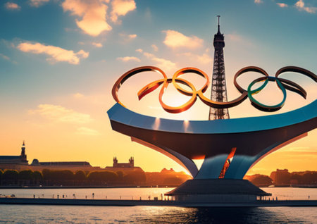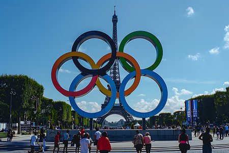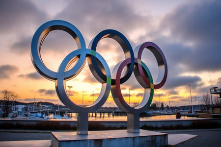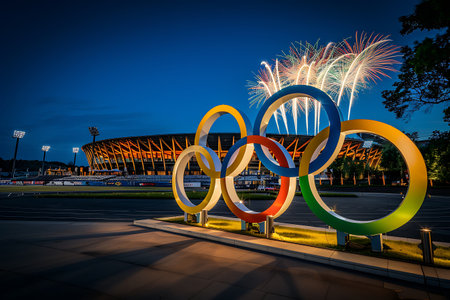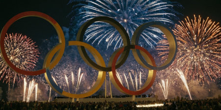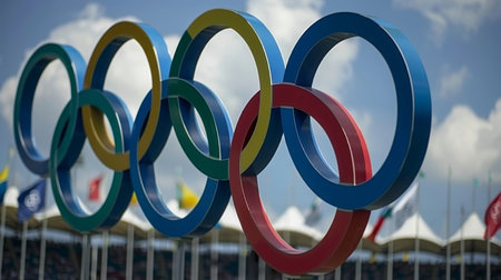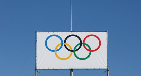 Olympic Rings Banner Displayed Against Clear Blue Sky – Symbol of Global Unity in Sports