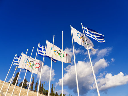 Olympic and Greek flags in Panathenaic stadium flying against blue sky with clouds, symbolizing Olympic Games in Greece