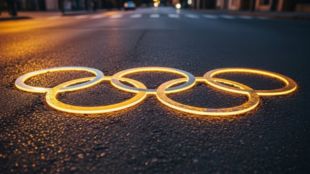 Glowing Olympic rings on dark asphalt street, city lights