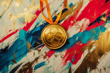 Triumph in gold with a color explosion. A gold medal is presented against a background with dynamic splashes of color, symbolic of the joy of victory and creativity, watercolors.