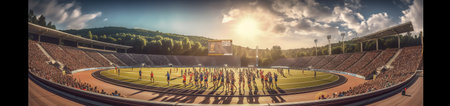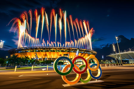 Dramatic Olympic Stadium with Fiery Pyrotechnics Against Evening Sky Full of Spectators.