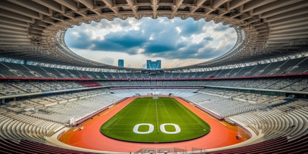 Rows of empty seats around a race track of a large stadium on sunny day before sports event