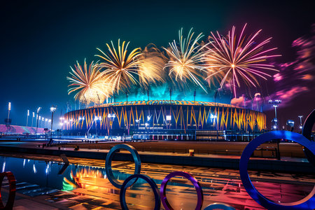 Colorful fireworks in the night sky over the grandstand of the stadium