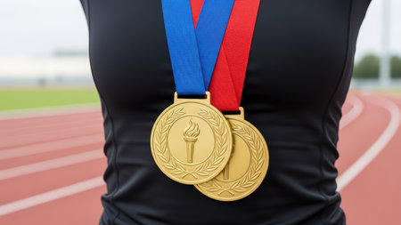 Athlete posing with gold medals on track field wearing black outfit.