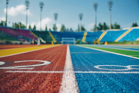 AI Generated. Running track with white lines in stadium Sport background Close up photo