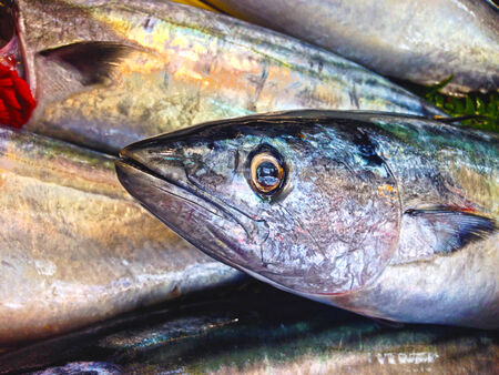 Raw fish in the ice on the seafood market stall shopping