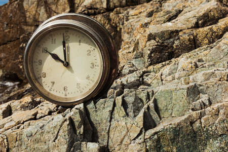 The old round ship's clock on a rock, summer on a rocky sea shore.