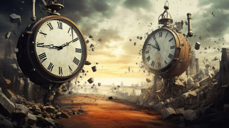 A black wall clock is partially disintegrating into dust, symbolizing the passage of time and impermanence.