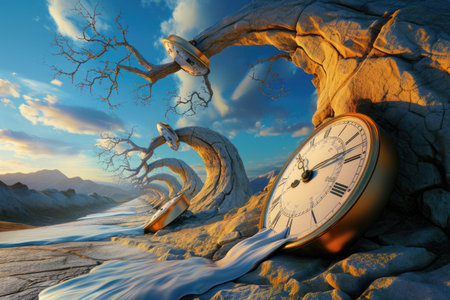 A painting depicts a large clock face melting into waves. The vibrant scene features a sunset or sunrise sky, with dramatic clouds. The artwork suggests concepts of time, change, and fluidity. Its visual characteristics make it suitable for a variety of editorial and commercial applications.