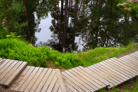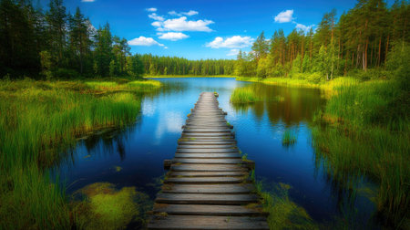 A dock with wooden path on a lake with green forest landscape. Beautiful summer nature background, calm blue water in the river. Generative AI.