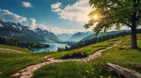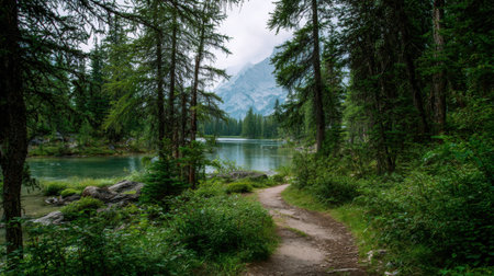 A forest trail winds through lush greenery, leading to a mountain lake surrounded by trees and light during midday hours.