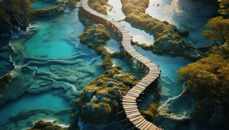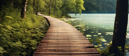 AI Generated. A wooden walkway next to a body of water surrounded by trees