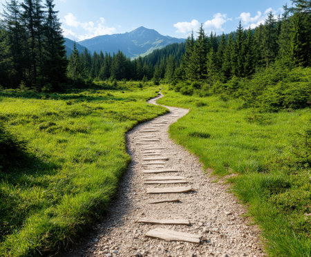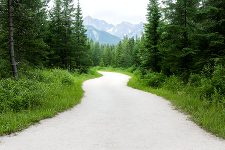 A serene winding path through a lush green forest invites exploration, leading to majestic mountains in the distance. Perfect for outdoor enthusiasts.
