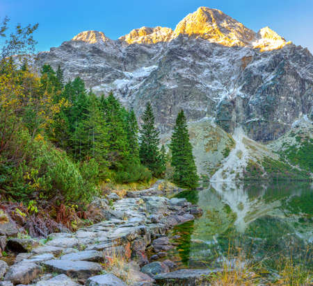 View to Czarny Staw Gasienicowy at dawn in summer, Tatras