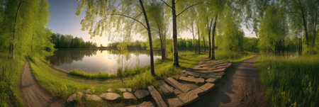 A stone path leads alongside a reflective body of water, capturing lush green foliage. Sunlight filters through the overhead trees, creating highlights and shadows. The image showcases a natural outdoor environment with a tranquil atmosphere. Suitable for use in various commercial and editorial projects.