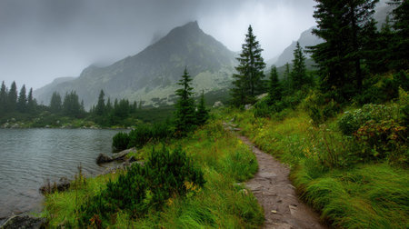 Hiking trail in the mountains. Summer landscape with lake and forest