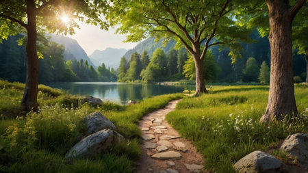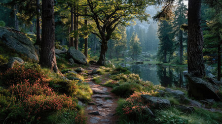 Serene forest leads to a tranquil lake, sunlight filtering through pine trees, creating a mesmerizing and peaceful scene.