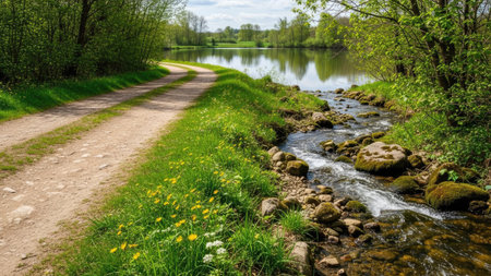stepping stones that lead across a stream or creek, with greenery and wildlife in the background, created with generative ai