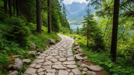 Misty forest trail lined with moss-covered stones leads into the foggy mountains, creating a mysterious and tranquil natural scenery, Ai-Generated.
