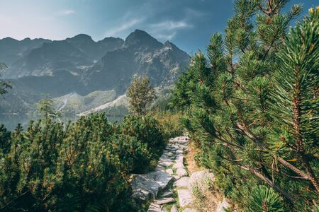 Tatra National Park, Poland. Trail Near Mountains Lake Morskie Oko Or Sea Eye Lake In Summer Morning. Five Lakes Valley. Beautiful Scenic View. European Nature