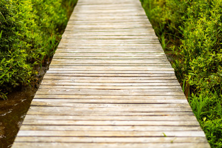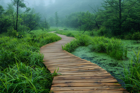 Narrow wooden pathway winding through a lush green wetland, covered in morning mist. AI generated.