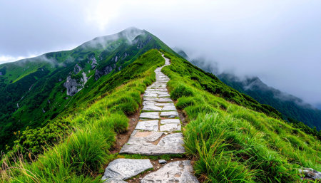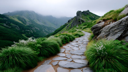 A serene mountain pathway lined with stones leads through vibrant greenery and rolling hills under a soft, cloudy sky, inviting exploration and adventure.
