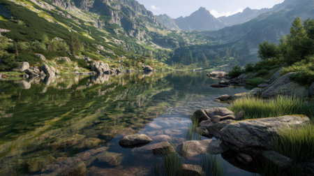 A stunning mountain landscape showcasing clear water reflecting the surrounding greenery and rugged rock formations under a bright sky.