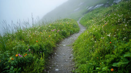 A narrow hiking trail meandering through foggy mountain terrain, bordered by tall grass and wildflowers.
