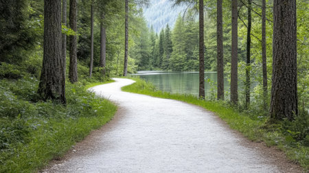A beautiful, serene pathway meanders through a lush green forest, where tall trees rise majestically, showcasing nature's tranquility and peacefulness.