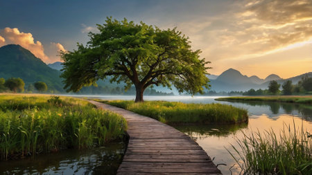 Discover a peaceful wooden pathway extending over still waters, surrounded by lush greenery and trees. Ideal for nature lovers and serene landscapes.