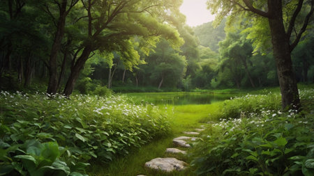 A picturesque pond scene showcases a stone pathway leading through lush greenery. The image features a shallow water body, reflecting the surrounding foliage and creating a sense of depth. Soft lighting illuminates the pathway, emphasizing the textures. This could be useful for projects related to nature, tranquility, or travel.