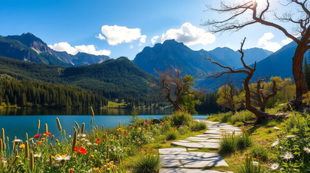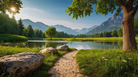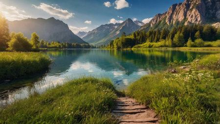 Landscape of national park with lake and mountains, created using generative ai technology. National park, scenery and beauty in nature concept digitally generated image.