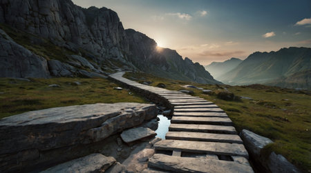 Stone path winding through a mountain valley, surrounded by green grass and rocky peaks