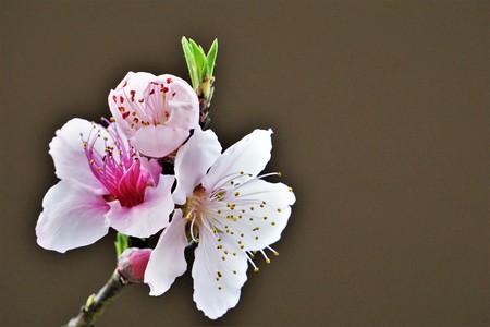 Buds and flowers on a branch of a Japanese cherry tree. Spring blossoms. Nature macro.