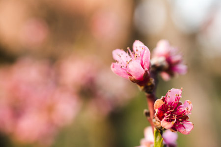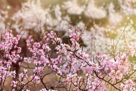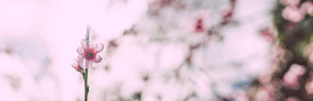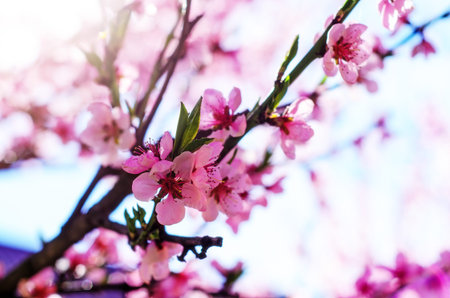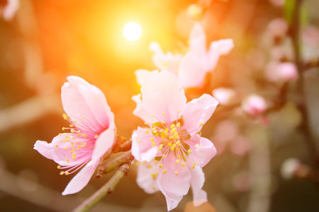 Spring background art with pink peach blossom. Beautiful nature scene with blooming tree and sun flare. Abstract blurred background. Shallow depth of field.