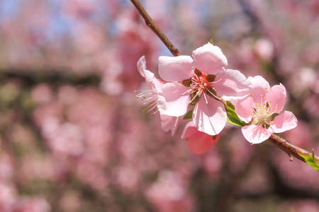 View of field with flowering peach trees at sunny spring day over blue sky. Close-up blossoming. Texture of pink flowers.