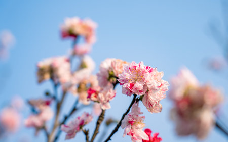 branches with beautiful pink flowers (Peach) against the blue sky. Selective Focus.