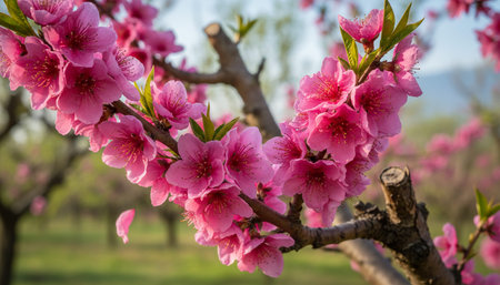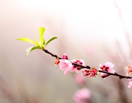 Pink peach blossoms in full bloom, delicate flowers on branches