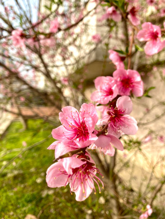 close-up of pink nectarine tree blossoms outdoor in beautiful backyard shot at shallow depth of field