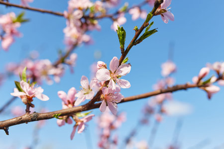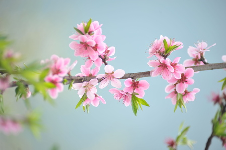 Beautiful peach branches with pink blossom in a blue sky. selective focus.
