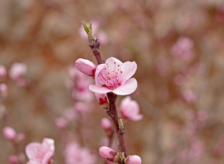Pink flower on a peach branch close up. Detail of the flower of a peach tree in spring.