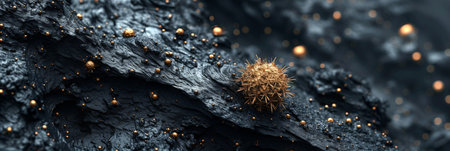 Closeup of a gold object resting on a black rock with gold dots abstract and luxurious concept for design and creativity